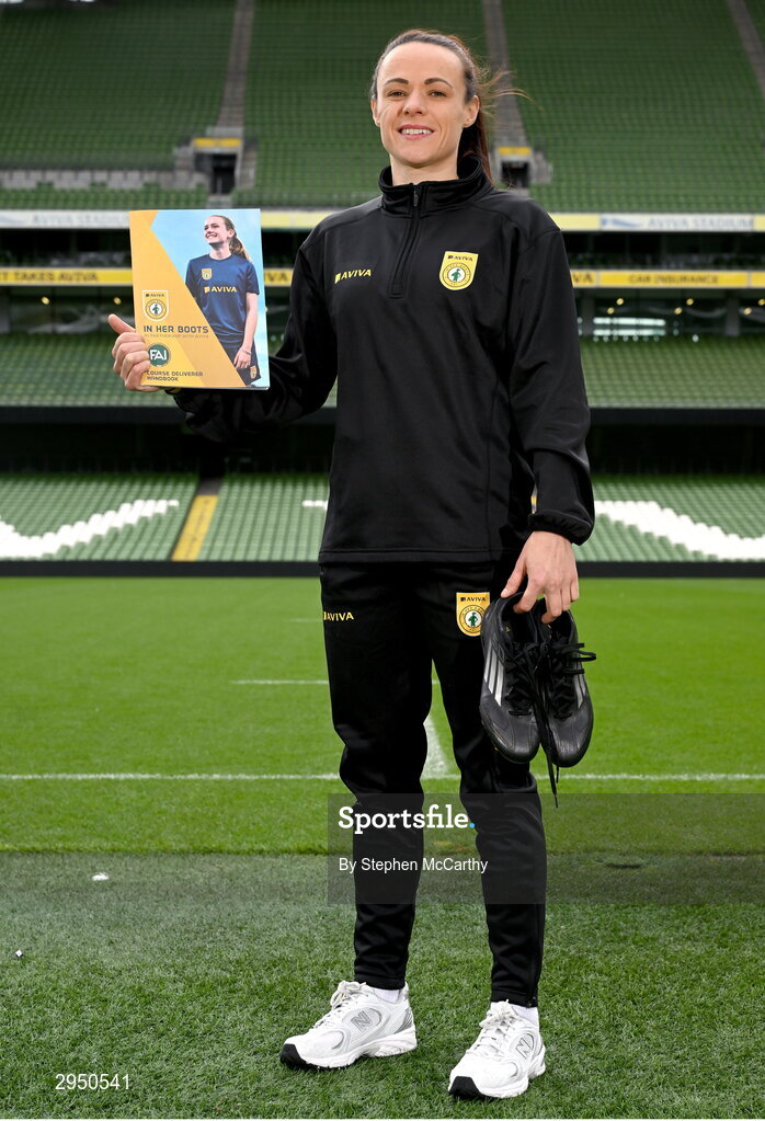 29 September 2024; Áine O’Gorman, Shamrock Rovers captain and Ireland WNT centurion, at the In Her Boots launch in Aviva Stadium, Dublin. Aviva, in partnership with the Football Association of Ireland (FAI), has launched In Her Boots, which is a new programme providing girls aged between 9-16 with specialist mentorship and coaching. Photo by Stephen McCarthy/Sportsfile