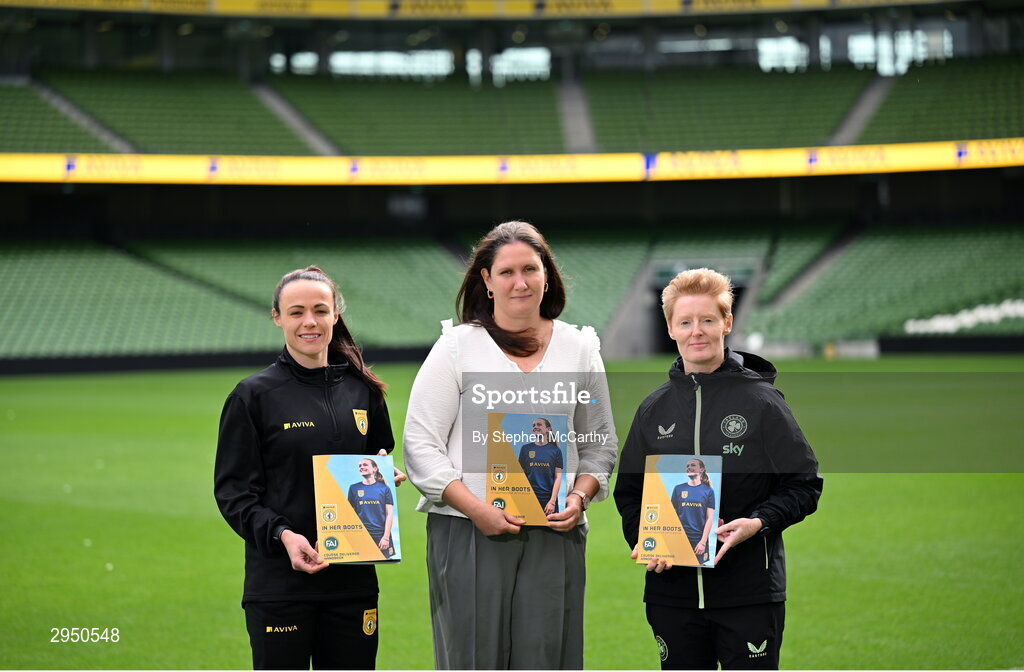 29 September 2024; Hannah Dingley, FAI head of women and girls football; centre, with Eileen Gleeson, Ireland WNT head coach; right, and Áine O’Gorman, Shamrock Rovers captain and Ireland WNT centurion, at the In Her Boots launch in Aviva Stadium, Dublin. Aviva, in partnership with the Football Association of Ireland (FAI), has launched In Her Boots, which is a new programme providing girls aged between 9-16 with specialist mentorship and coaching. Photo by Stephen McCarthy/Sportsfile