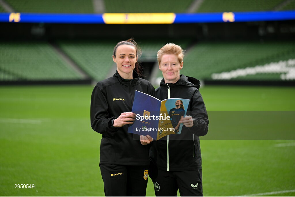 29 September 2024; Eileen Gleeson, Ireland WNT head coach; and Áine O’Gorman, Shamrock Rovers captain and Ireland WNT centurion, at the In Her Boots launch in Aviva Stadium, Dublin. Aviva, in partnership with the Football Association of Ireland (FAI), has launched In Her Boots, which is a new programme providing girls aged between 9-16 with specialist mentorship and coaching. Photo by Stephen McCarthy/Sportsfile