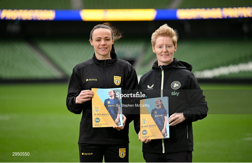 29 September 2024; Eileen Gleeson, Ireland WNT head coach; and Áine O’Gorman, Shamrock Rovers captain and Ireland WNT centurion, at the In Her Boots launch in Aviva Stadium, Dublin. Aviva, in partnership with the Football Association of Ireland (FAI), has launched In Her Boots, which is a new programme providing girls aged between 9-16 with specialist mentorship and coaching. Photo by Stephen McCarthy/Sportsfile