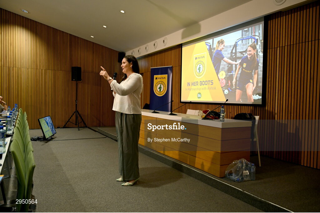 29 September 2024; FAI head of women's football Hannah Dingley during the launch of the In Her Boots programme at the Aviva Stadium in Dublin. In Her Boots programme is an education and awareness-based programme aimed at the football volunteer workforce across Ireland working with female players (9-16years). The programme will focus on topics that are vital for the participation and retention of young female players in football across Ireland. This new approach to female player development, celebrates and informs all levels of your club on a national scale. Photo by Stephen McCarthy/Sportsfile