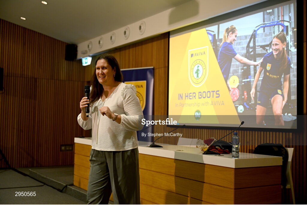 29 September 2024; FAI head of women's football Hannah Dingley during the launch of the In Her Boots programme at the Aviva Stadium in Dublin. In Her Boots programme is an education and awareness-based programme aimed at the football volunteer workforce across Ireland working with female players (9-16years). The programme will focus on topics that are vital for the participation and retention of young female players in football across Ireland. This new approach to female player development, celebrates and informs all levels of your club on a national scale. Photo by Stephen McCarthy/Sportsfile