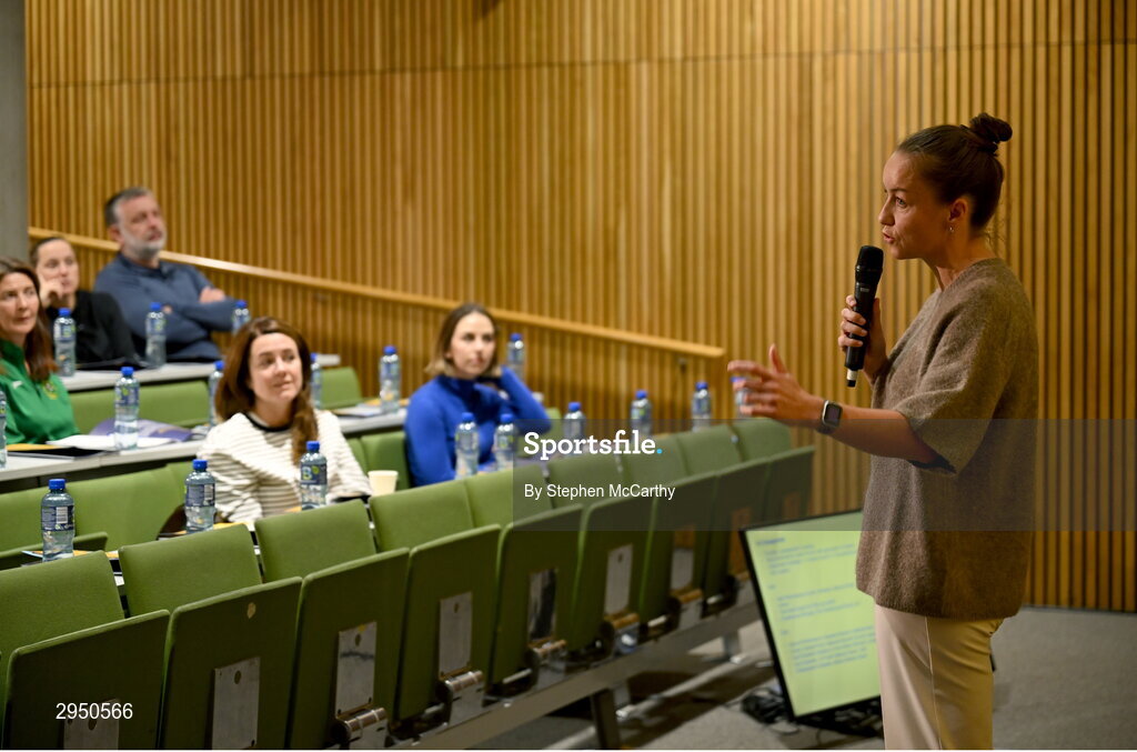 29 September 2024; FAI's women’s football programme coordinator Pearl Slattery during the launch of the In Her Boots programme at the Aviva Stadium in Dublin. In Her Boots programme is an education and awareness-based programme aimed at the football volunteer workforce across Ireland working with female players (9-16years). The programme will focus on topics that are vital for the participation and retention of young female players in football across Ireland. This new approach to female player development, celebrates and informs all levels of your club on a national scale. Photo by Stephen McCarthy/Sportsfile
