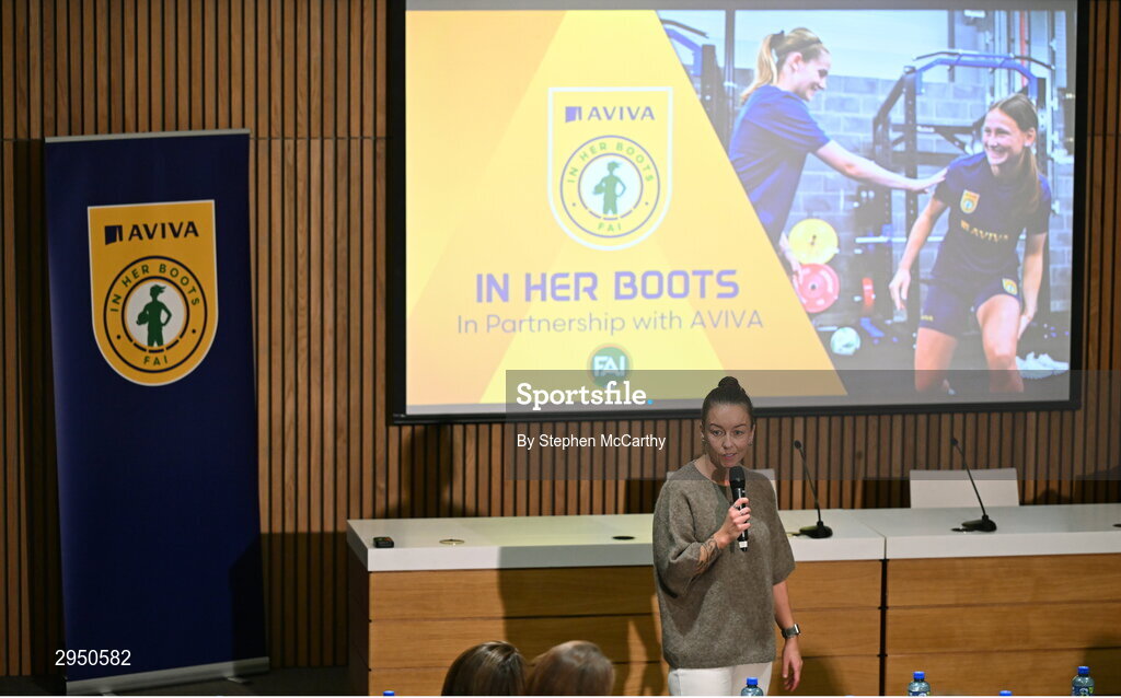 29 September 2024; FAI's women’s football programme coordinator Pearl Slattery during the launch of the In Her Boots programme at the Aviva Stadium in Dublin. In Her Boots programme is an education and awareness-based programme aimed at the football volunteer workforce across Ireland working with female players (9-16years). The programme will focus on topics that are vital for the participation and retention of young female players in football across Ireland. This new approach to female player development, celebrates and informs all levels of your club on a national scale. Photo by Stephen McCarthy/Sportsfile