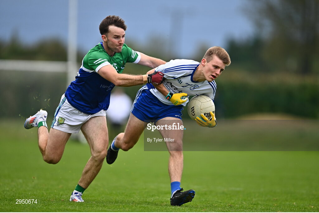 29 September 2024; Rob Fitzgerald of Naas in action against Sam Doran of Johnstownbridge during the Kildare County Senior Club Football Championship quarter-final match between Naas and Johnstownbridge at Manguard Park Hawkfield in Newbridge, Kildare. Photo by Tyler Miller/Sportsfile
