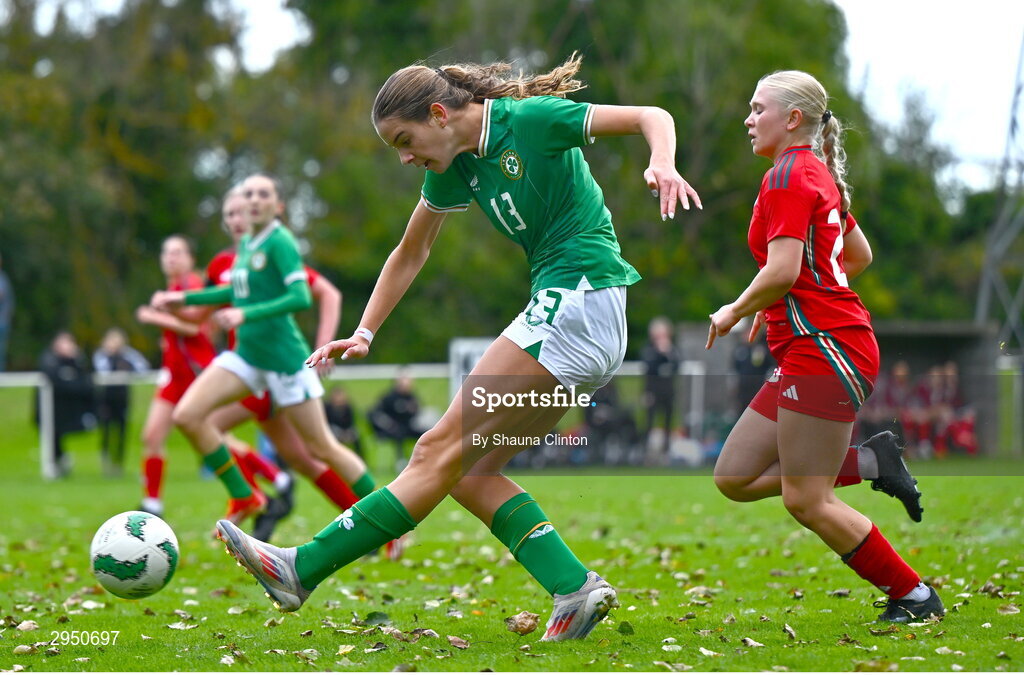 28 September 2024; Mary Hartofolis of Republic of Ireland has a shot on goal during the women's U17 international friendly match between Republic of Ireland and Cymru at the AUL Complex in Clonsaugh, Dublin. Photo by Shauna Clinton/Sportsfile