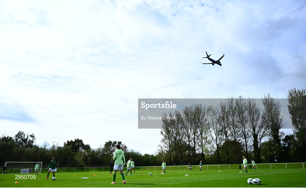 28 September 2024; An airplane flies overhead as Republic of Ireland players warm-up before the women's U17 international friendly match between Republic of Ireland and Cymru at the AUL Complex in Clonsaugh, Dublin. Photo by Shauna Clinton/Sportsfile
