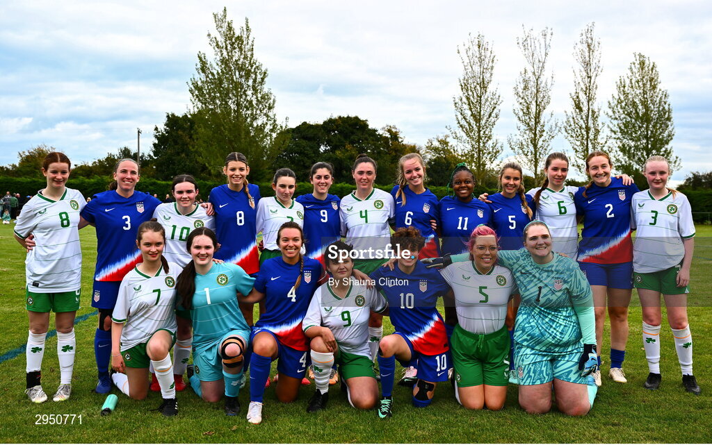 28 September 2024; Ireland players and USA players pose for a team photograph before the Cerebal Palsy women's international series match between Ireland and USA at the AUL Complex in Dublin. Photo by Shauna Clinton/Sportsfile