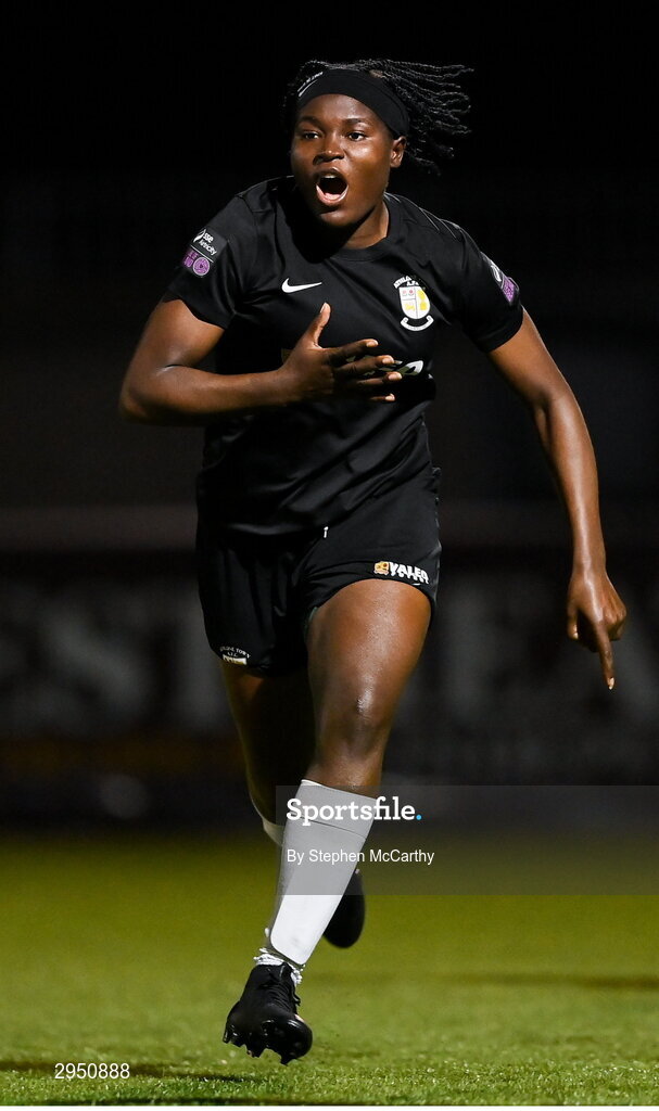 28 September 2024; Brenda Ebika Tabe of Athlone Town celebrates after scoring her side's first goal during the SSE Airtricity Women's Premier Division match between Athlone Town and Shamrock Rovers at Athlone Town Stadium in Westmeath. Photo by Stephen McCarthy/Sportsfile