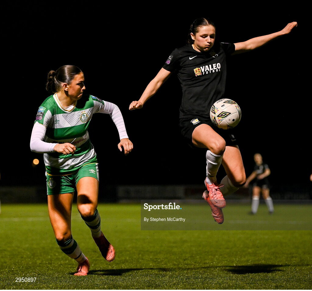28 September 2024; Roisin Molloy of Athlone Town in action against Maria Reynolds of Shamrock Rovers during the SSE Airtricity Women's Premier Division match between Athlone Town and Shamrock Rovers at Athlone Town Stadium in Westmeath. Photo by Stephen McCarthy/Sportsfile
