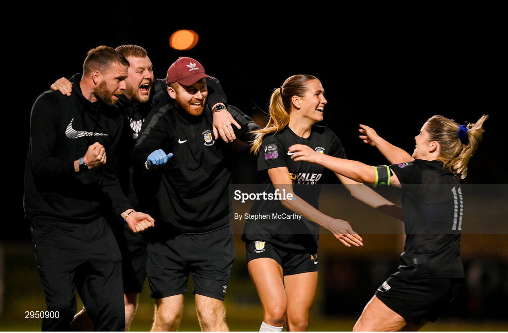 28 September 2024; Madison Gibson of Athlone Town celebrates with Laurie Ryan, right, and coaching staff after scoring their second goal during the SSE Airtricity Women's Premier Division match between Athlone Town and Shamrock Rovers at Athlone Town Stadium in Westmeath. Photo by Stephen McCarthy/Sportsfile
