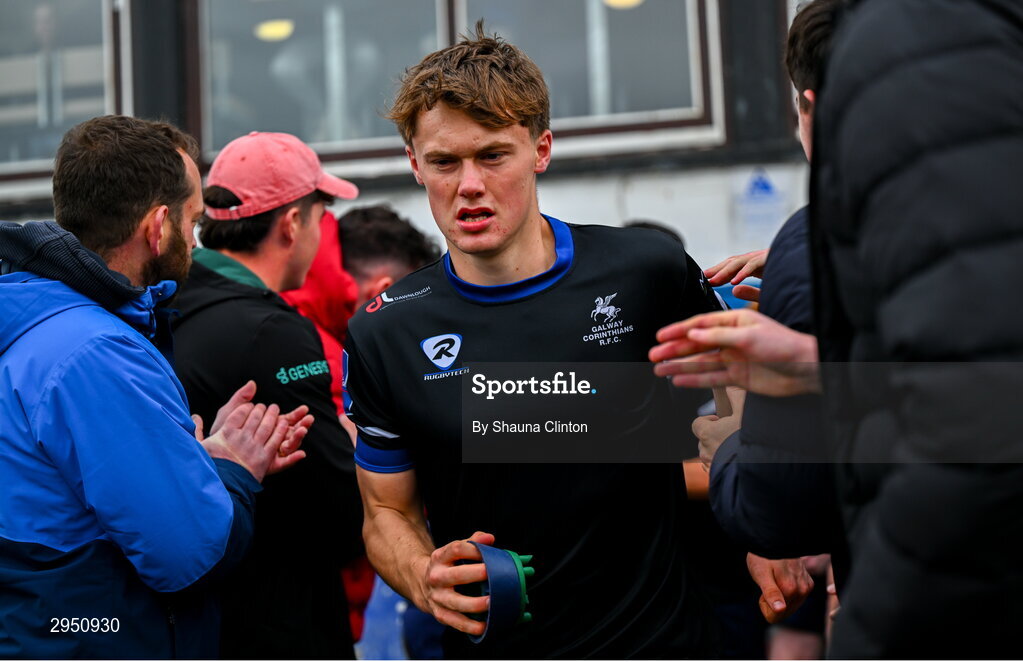 29 September 2024; Joseph Smyth of Corinthians runs out onto the pitch before the Bank of Ireland JP Fanagan Premier 1 qualifiers final match between Corinthians RFC and Blackrock College RFC at Corinthians RFC in Galway. Photo by Shauna Clinton/Sportsfile