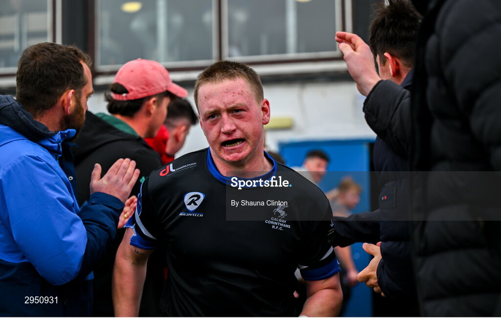 29 September 2024; Jack Pollard of Corinthians runs out onto the pitch before the Bank of Ireland JP Fanagan Premier 1 qualifiers final match between Corinthians RFC and Blackrock College RFC at Corinthians RFC in Galway. Photo by Shauna Clinton/Sportsfile