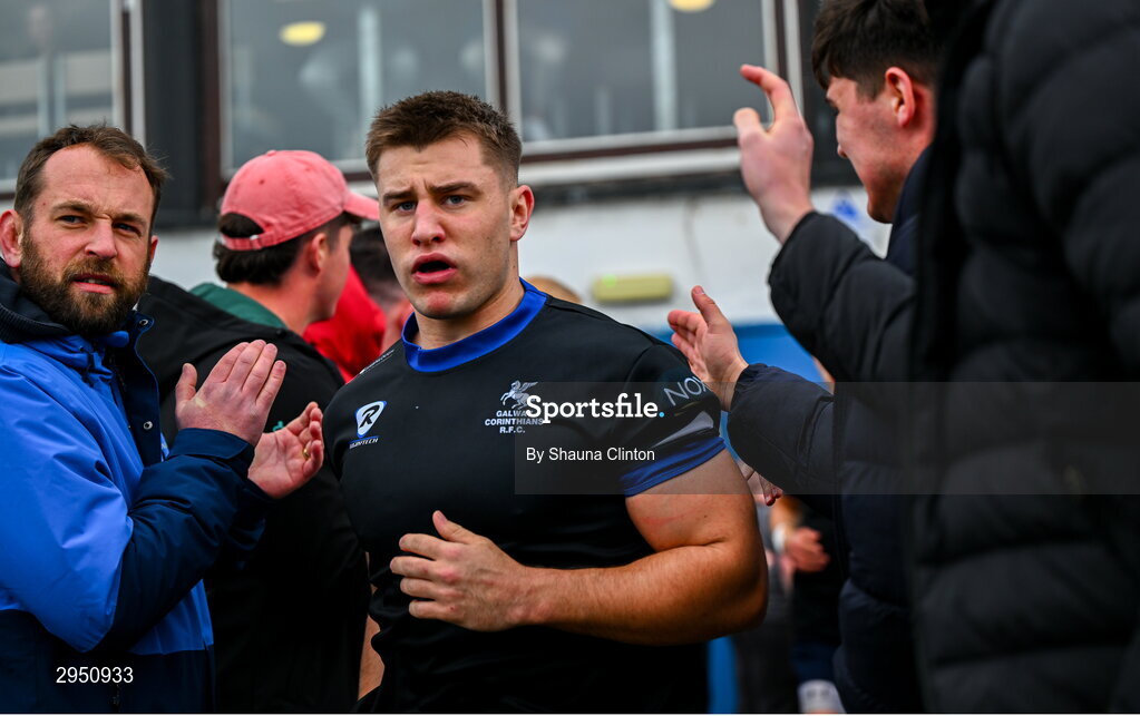 29 September 2024; Joey Tierney of Corinthians runs out onto the pitch before the Bank of Ireland JP Fanagan Premier 1 qualifiers final match between Corinthians RFC and Blackrock College RFC at Corinthians RFC in Galway. Photo by Shauna Clinton/Sportsfile