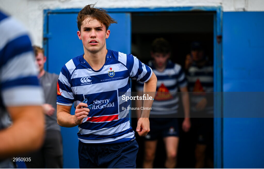 29 September 2024; Lochlainn Maher of Blackrock runs out onto the picth before the Bank of Ireland JP Fanagan Premier 1 qualifiers final match between Corinthians RFC and Blackrock College RFC at Corinthians RFC in Galway. Photo by Shauna Clinton/Sportsfile