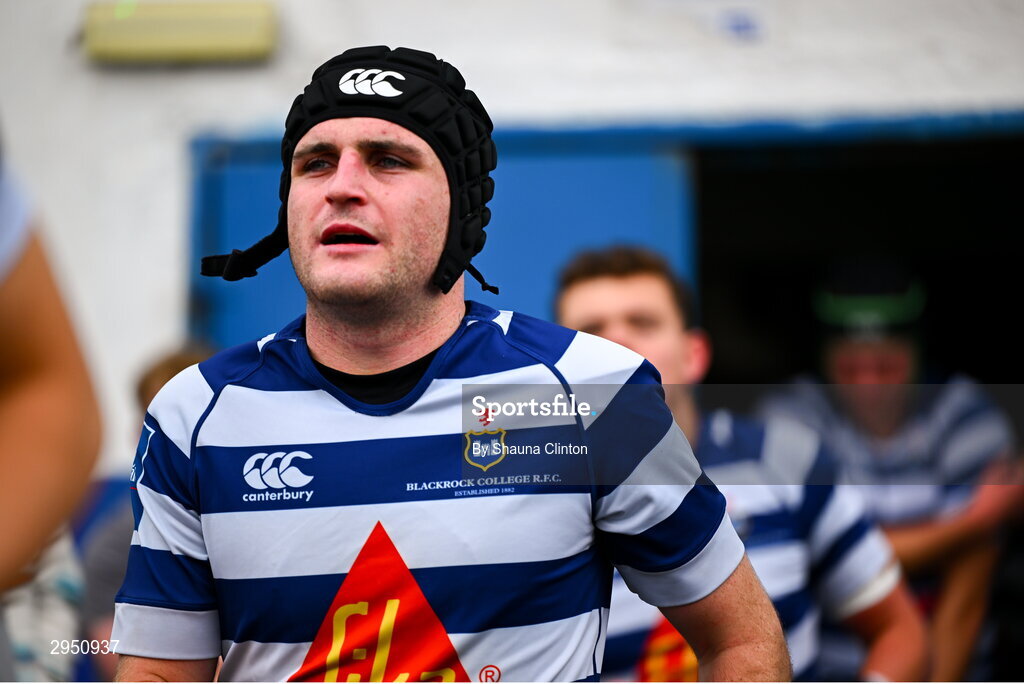 29 September 2024; Jamie Rogan of Blackrock runs out onto the picth before the Bank of Ireland JP Fanagan Premier 1 qualifiers final match between Corinthians RFC and Blackrock College RFC at Corinthians RFC in Galway. Photo by Shauna Clinton/Sportsfile