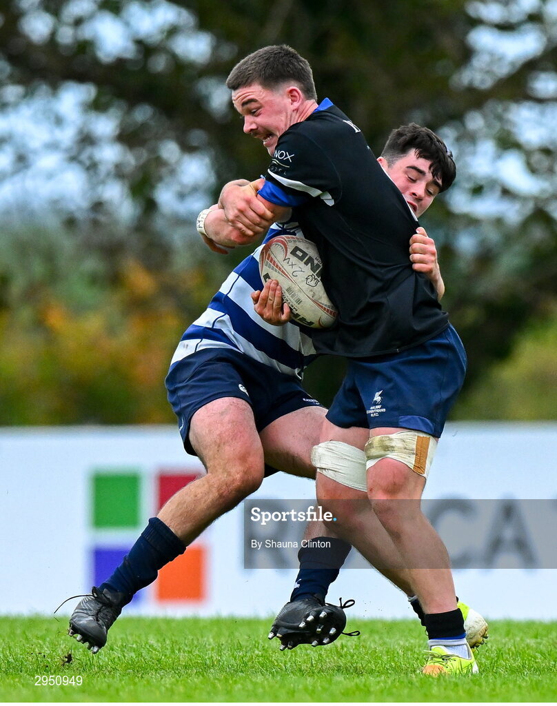 29 September 2024; Patrick Flannery of Corinthians is tackled by Paddy Moore of Blackrock during the Bank of Ireland JP Fanagan Premier 1 qualifiers final match between Corinthians RFC and Blackrock College RFC at Corinthians RFC in Galway. Photo by Shauna Clinton/Sportsfile
