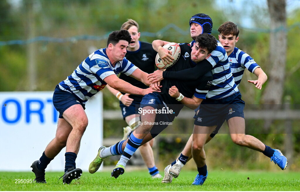 29 September 2024; Jack Conway of Corinthians is tackled by Jed O'Malley of Blackrock during the Bank of Ireland JP Fanagan Premier 1 qualifiers final match between Corinthians RFC and Blackrock College RFC at Corinthians RFC in Galway. Photo by Shauna Clinton/Sportsfile