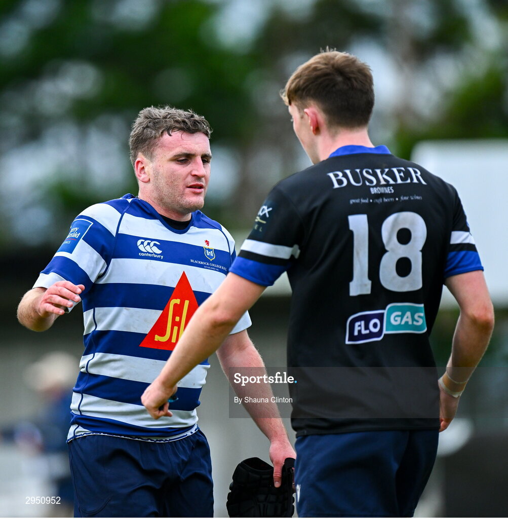 29 September 2024; Jamie Rogan of Blackrock and John Hughes of Corinthians shake hands after the Bank of Ireland JP Fanagan Premier 1 qualifiers final match between Corinthians RFC and Blackrock College RFC at Corinthians RFC in Galway. Photo by Shauna Clinton/Sportsfile
