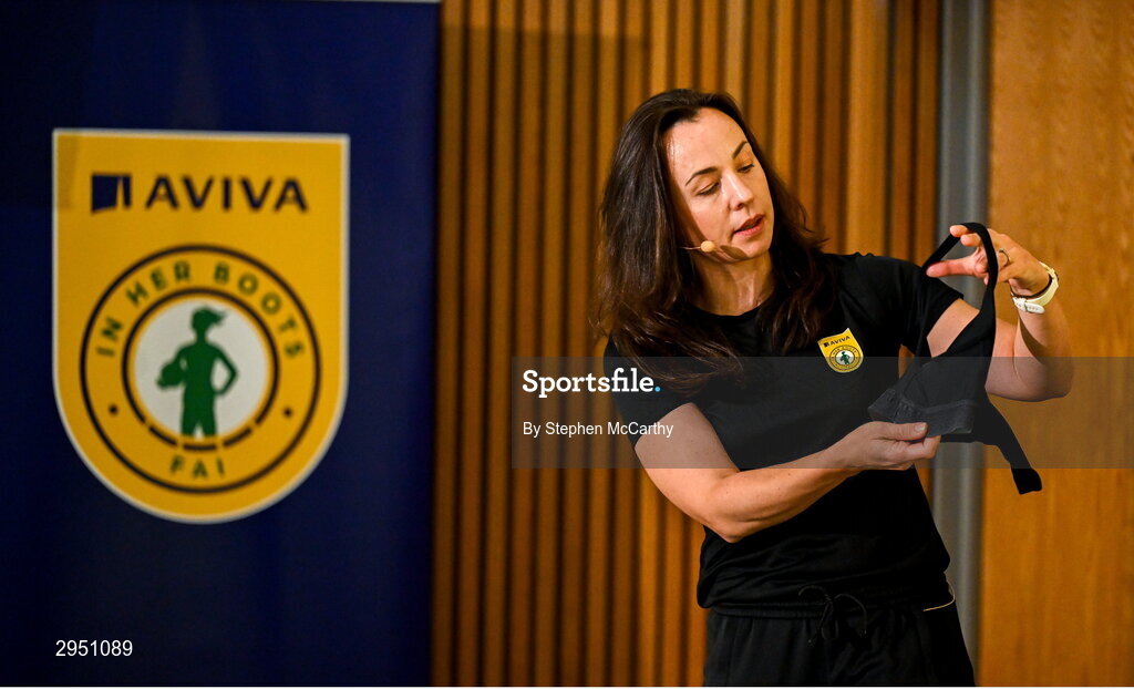 29 September 2024; Republic of Ireland women's team physiotherapist Angela Kenneally during the launch of the In Her Boots programme at the Aviva Stadium in Dublin. In Her Boots programme is an education and awareness-based programme aimed at the football volunteer workforce across Ireland working with female players (9-16years). The programme will focus on topics that are vital for the participation and retention of young female players in football across Ireland. This new approach to female player development, celebrates and informs all levels of your club on a national scale. Photo by Stephen McCarthy/Sportsfile