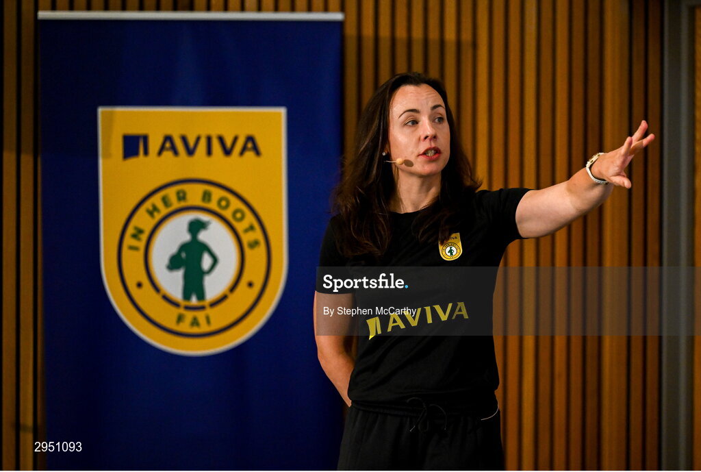 29 September 2024; Republic of Ireland women's team physiotherapist Angela Kenneally during the launch of the In Her Boots programme at the Aviva Stadium in Dublin. In Her Boots programme is an education and awareness-based programme aimed at the football volunteer workforce across Ireland working with female players (9-16years). The programme will focus on topics that are vital for the participation and retention of young female players in football across Ireland. This new approach to female player development, celebrates and informs all levels of your club on a national scale. Photo by Stephen McCarthy/Sportsfile