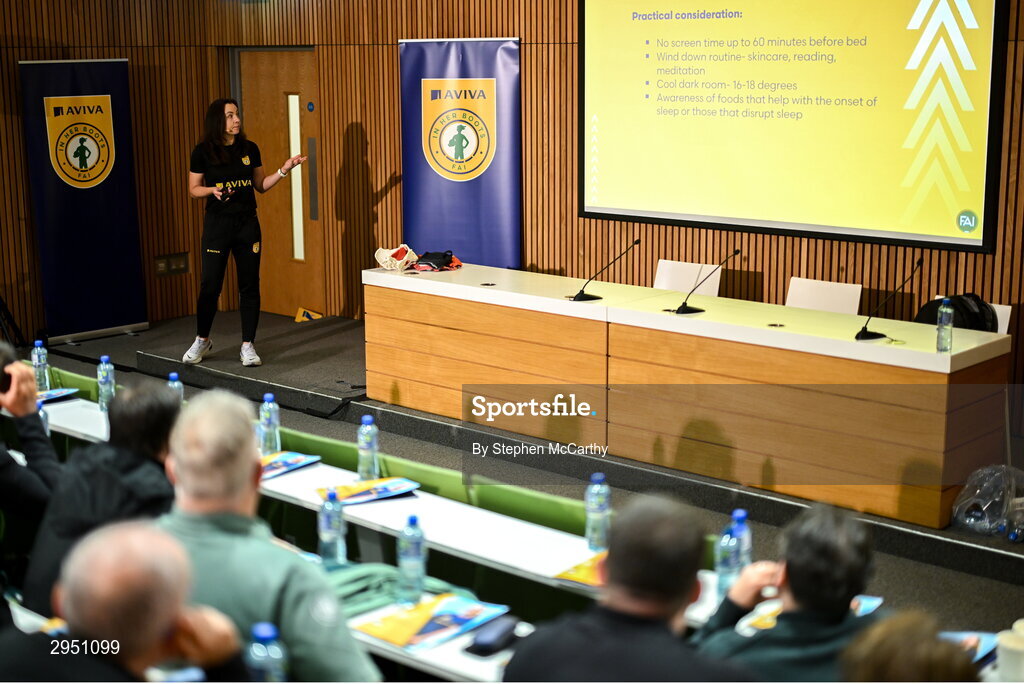 29 September 2024; Republic of Ireland women's team physiotherapist Angela Kenneally during the launch of the In Her Boots programme at the Aviva Stadium in Dublin. In Her Boots programme is an education and awareness-based programme aimed at the football volunteer workforce across Ireland working with female players (9-16years). The programme will focus on topics that are vital for the participation and retention of young female players in football across Ireland. This new approach to female player development, celebrates and informs all levels of your club on a national scale. Photo by Stephen McCarthy/Sportsfile
