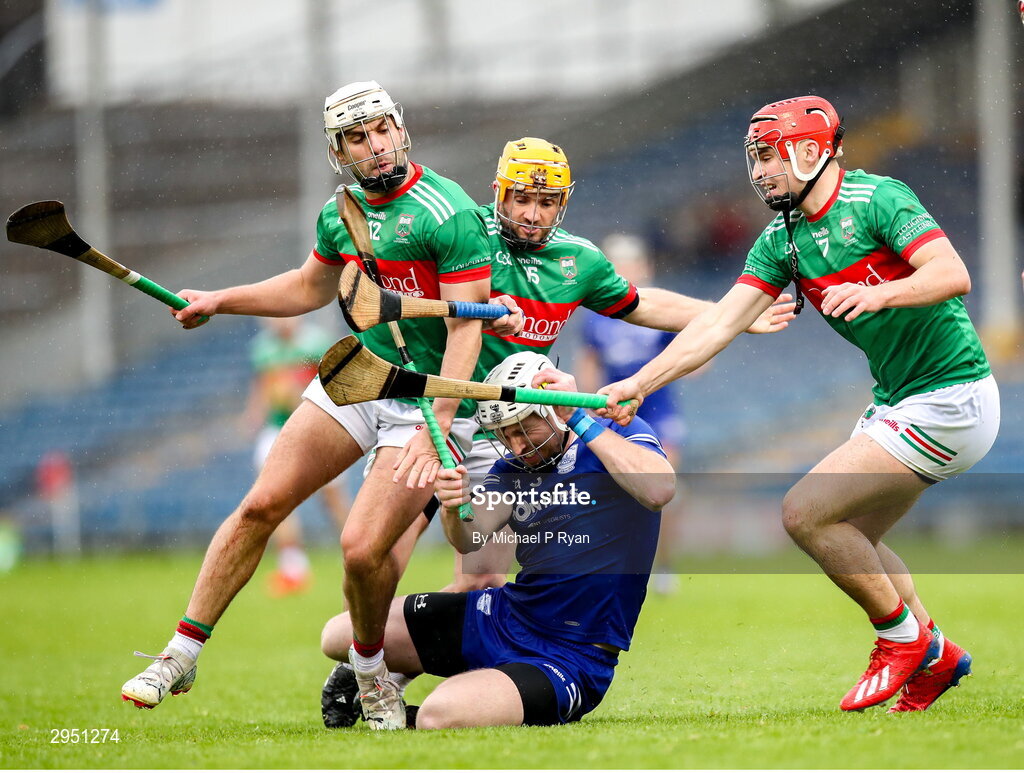 29 September 2024; Denis Maher of Thurles Sarsfields in action against Loughmore Castleiney players from left, Ed Connolly, Liam McGrath, and Eoin O'Connell during the Tipperary County Senior Club Hurling Championship semi-final match between Loughmore Castleiney and Thurles Sarsfields at FBD Semple Stadium in Thurles, Tipperary. Photo by Michael P Ryan/Sportsfile
