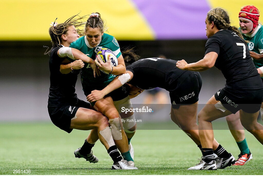 29 September 2024; Eimear Considine of Ireland is tackled by Renee Holmes and Sylvia Brunt of New Zealand during the WXV1 Pool match between New Zealand and Ireland at BC Place in Vancouver, British Columbia. Photo by Rich Lam / World Rugby via Sportsfile