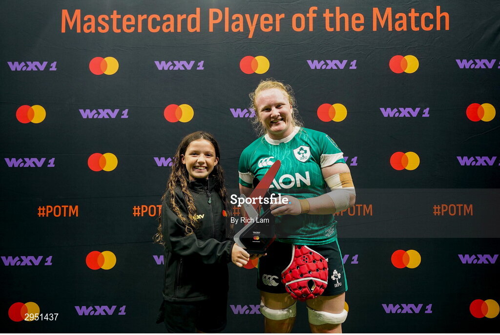 29 September 2024; Aoife Wafer of Ireland is presented with the Mastercard Player of the Match after the WXV1 Pool match between New Zealand and Ireland at BC Place in Vancouver, British Columbia. Photo by Rich Lam / World Rugby via Sportsfile