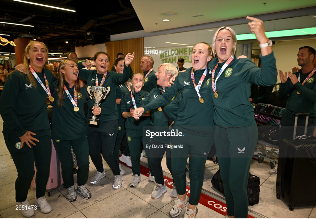 18 September 2024; The team on arrival at Dublin Airport during the Men's and Women's Republic of Ireland Homeless teams' return from the 2024 Homeless World Cup in South Korea, where the Women's Team won the Trophy Stage and the Men's Team finished 8th. Photo by David Fitzgerald/Sportsfile