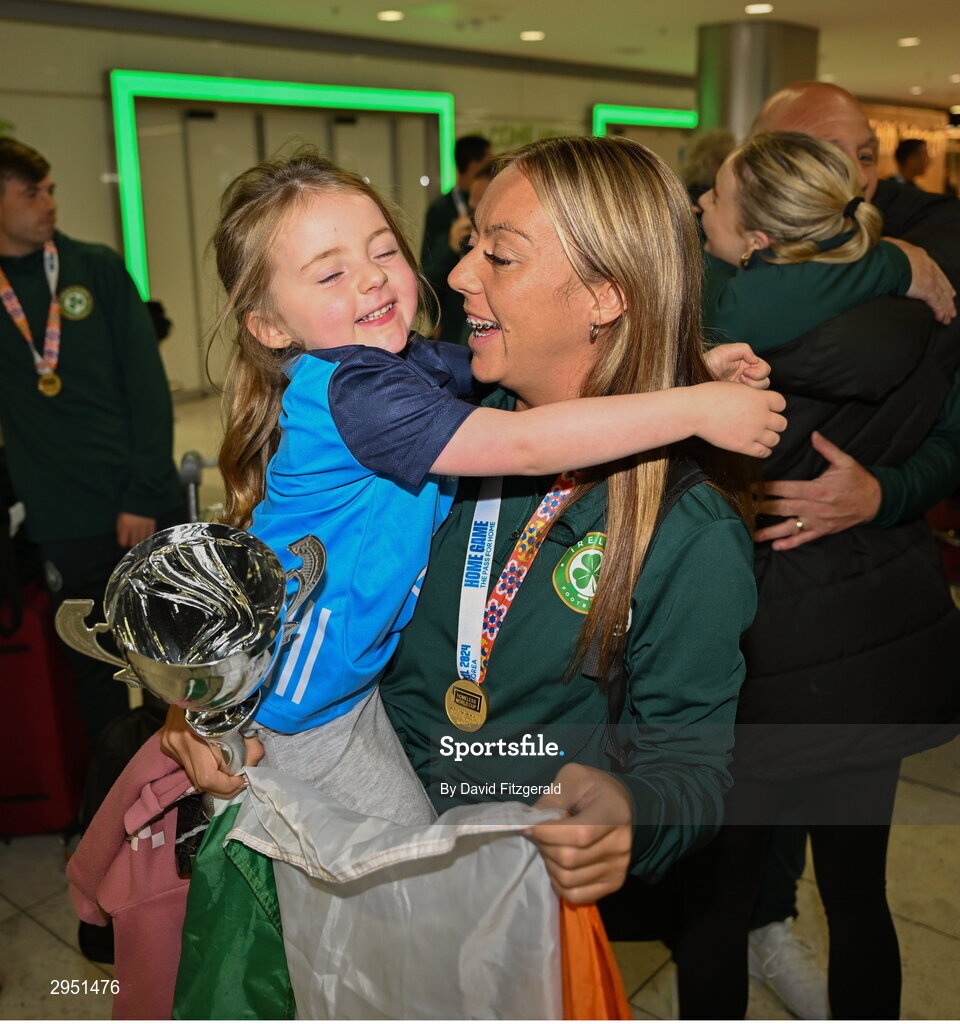 18 September 2024; Niamh Ryan with her daughter Ailbhe, age 3, on arrival at Dublin Airport during the Men's and Women's Republic of Ireland Homeless teams' return from the 2024 Homeless World Cup in South Korea, where the Women's Team won the Trophy Stage and the Men's Team finished 8th. Photo by David Fitzgerald/Sportsfile