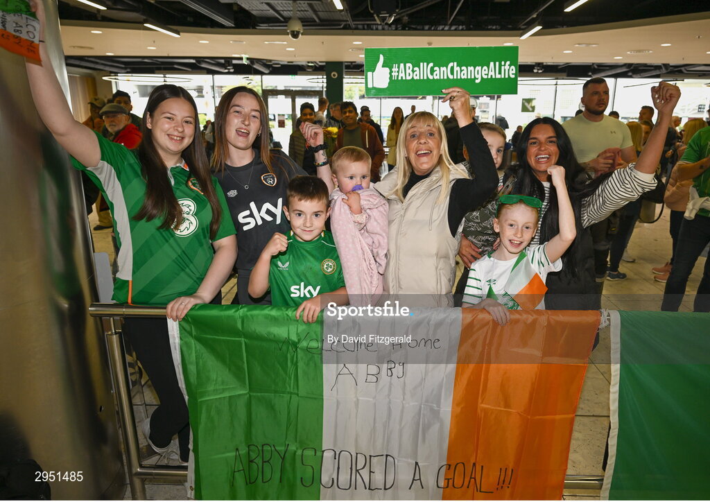 18 September 2024; Families and supporters at Dublin Airport during the Men's and Women's Republic of Ireland Homeless teams' return from the 2024 Homeless World Cup in South Korea, where the Women's Team won the Trophy Stage and the Men's Team finished 8th. Photo by David Fitzgerald/Sportsfile