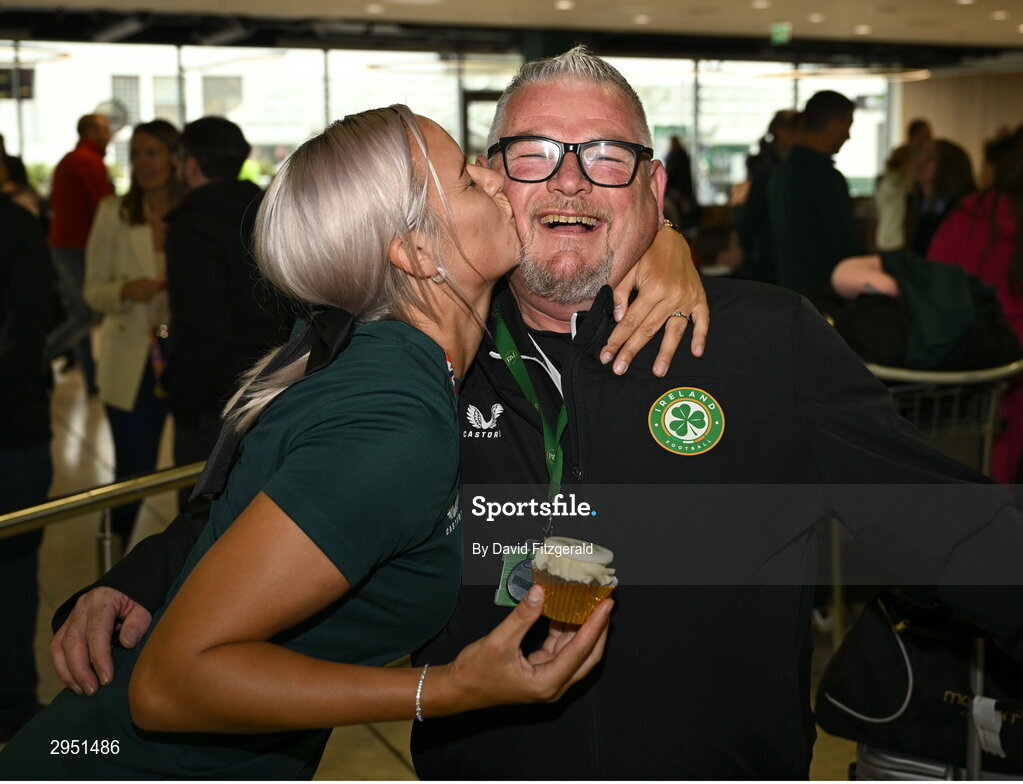 18 September 2024; Siobhan Kennedy and coach Alan O'Halloran on arrival at Dublin Airport during the Men's and Women's Republic of Ireland Homeless teams' return from the 2024 Homeless World Cup in South Korea, where the Women's Team won the Trophy Stage and the Men's Team finished 8th. Photo by David Fitzgerald/Sportsfile