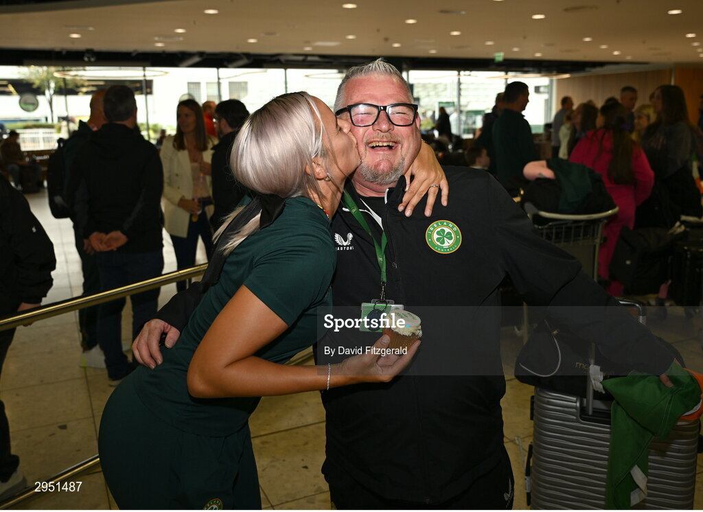 18 September 2024; Siobhan Kennedy and coach Alan O'Halloran on arrival at Dublin Airport during the Men's and Women's Republic of Ireland Homeless teams' return from the 2024 Homeless World Cup in South Korea, where the Women's Team won the Trophy Stage and the Men's Team finished 8th. Photo by David Fitzgerald/Sportsfile