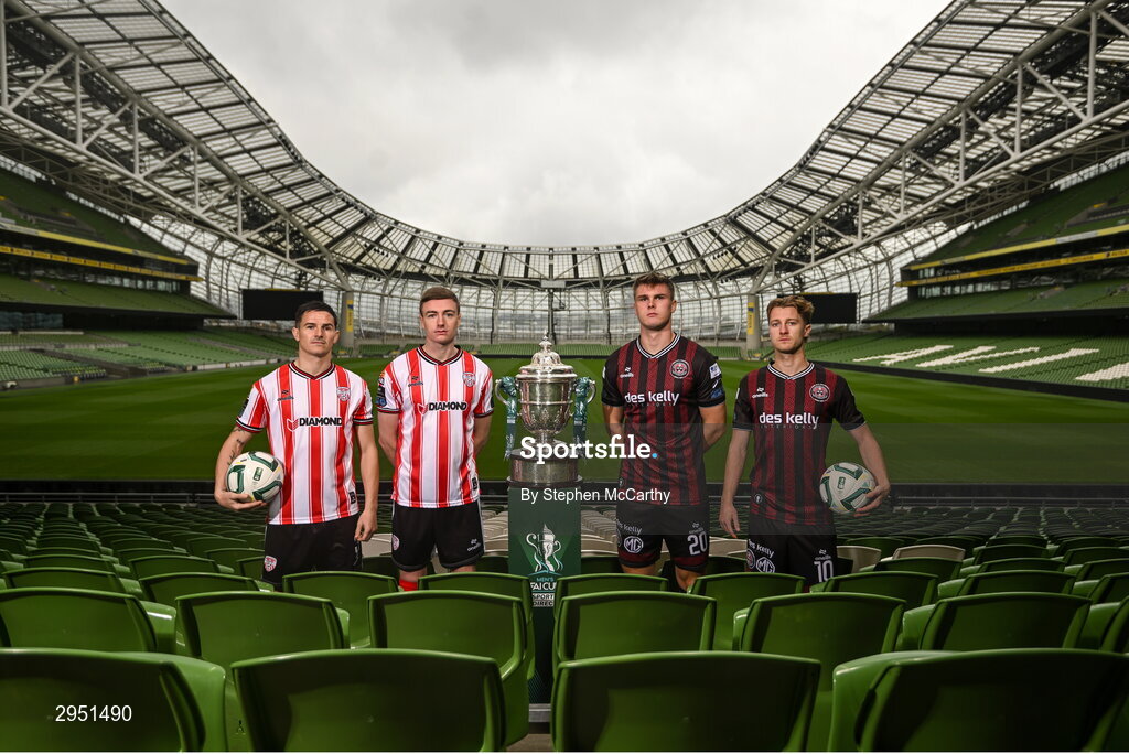 30 September 2024; Derry City's Ciaran Coll, left, and Daniel Kelly with Bohemians' Leigh Kavanagh and Alex Grieve, right, during the Sports Direct Men's FAI Cup semi-finals media day at the Aviva Stadium in Dublin. Photo by Stephen McCarthy/Sportsfile