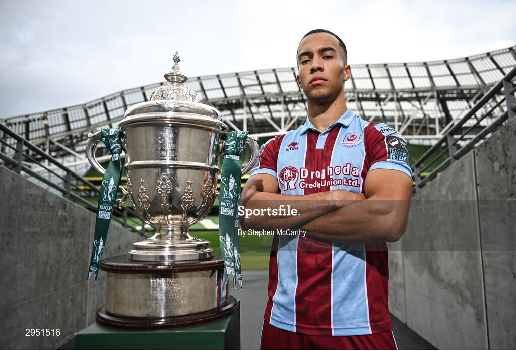 30 September 2024; Drogheda United's Douglas James Taylor poses for a portrait during the Sports Direct Men's FAI Cup semi-finals media day at the Aviva Stadium in Dublin. Photo by Stephen McCarthy/Sportsfile