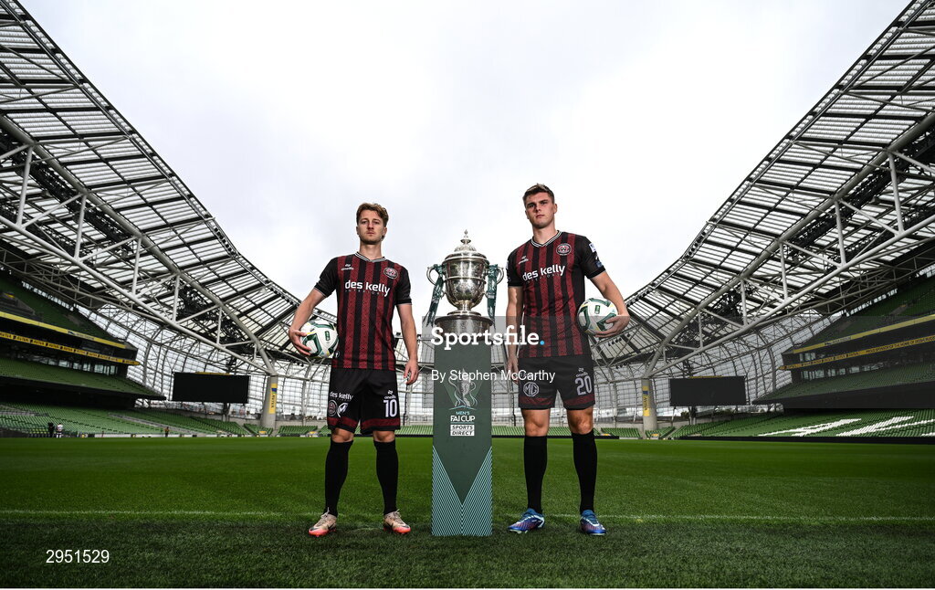 30 September 2024; Bohemians' Alex Grieve, left, and Leigh Kavanagh pose for a portrait during the Sports Direct Men's FAI Cup semi-finals media day at the Aviva Stadium in Dublin. Photo by Stephen McCarthy/Sportsfile
