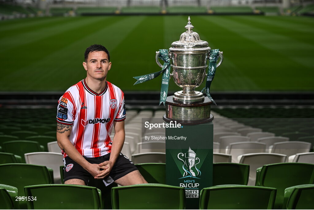 30 September 2024; Derry City's Ciaran Coll poses for a portrait during the Sports Direct Men's FAI Cup semi-finals media day at the Aviva Stadium in Dublin. Photo by Stephen McCarthy/Sportsfile