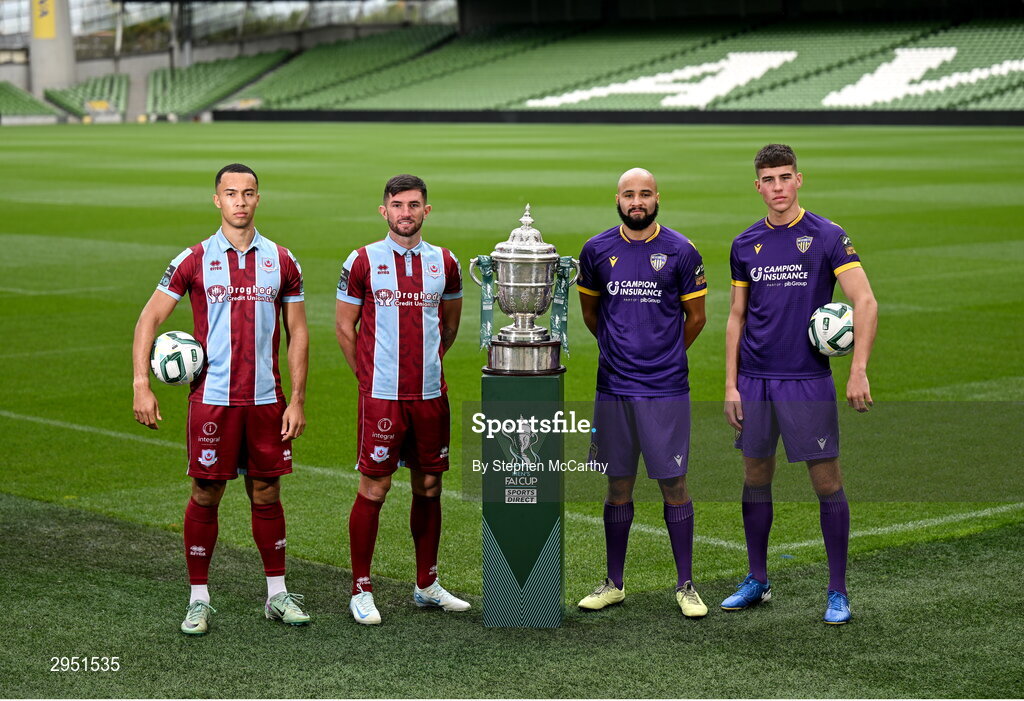 30 September 2024; Drogheda United's Douglas James Taylor, left, and Luke Heeney with Wexford's Ethan Boyle and Lewis Temple, right, during the Sports Direct Men's FAI Cup semi-finals media day at the Aviva Stadium in Dublin. Photo by Stephen McCarthy/Sportsfile