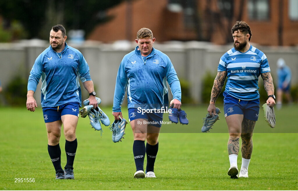 30 September 2024; Leinster players, from left, Cian Healy, Tadhg Furlong and Andrew Porter arrive for during squad training at UCD in Dublin. Photo by Brendan Moran/Sportsfile