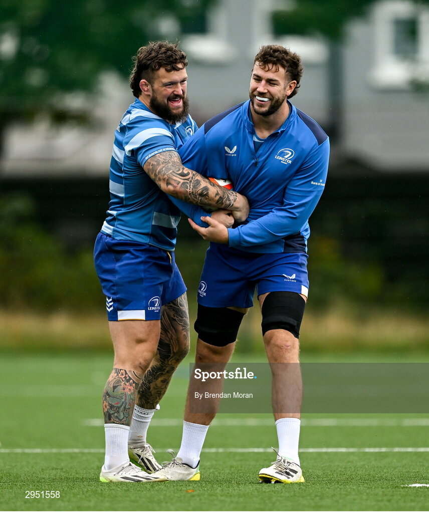 30 September 2024; Andrew Porter, left, and Caelan Doris during Leinster rugby training at UCD in Dublin. Photo by Brendan Moran/Sportsfile