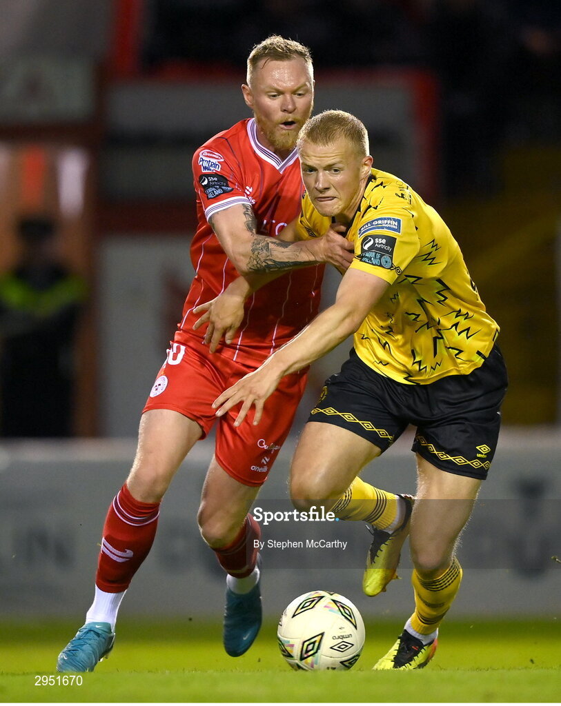 30 September 2024; Tom Grivosti of St Patrick's Athletic in action against Aiden O'Brien of Shelbourne during the SSE Airtricity Men's Premier Division match between Shelbourne and St Patrick's Athletic at Tolka Park in Dublin. Photo by Stephen McCarthy/Sportsfile
