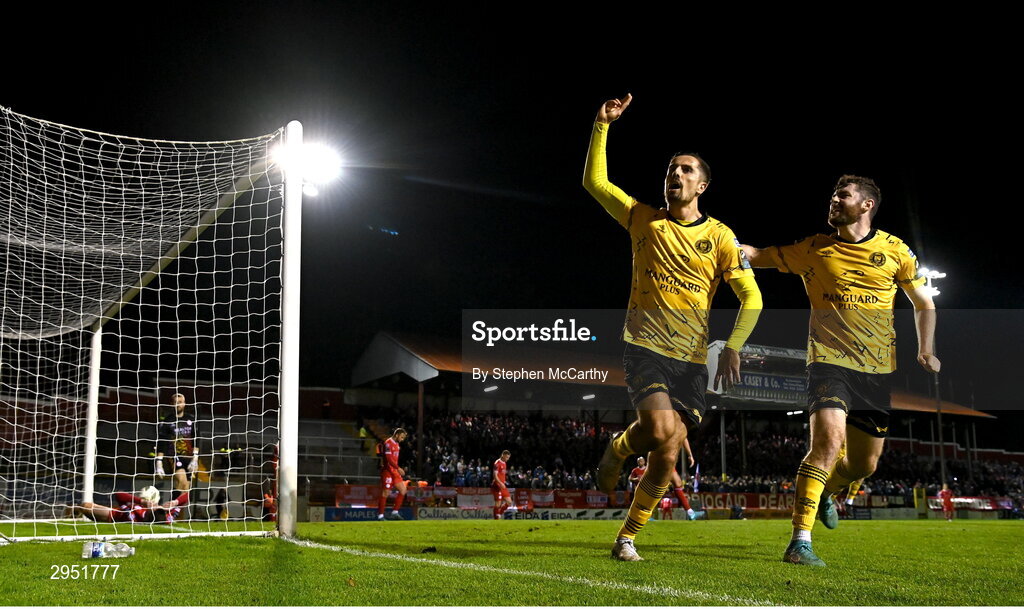 30 September 2024; Zach Elbouzedi, left, and Aidan Keena of St Patrick's Athletic celebrate after team-mate Brandon Kavanagh, not pictured, scored their side's second goal during the SSE Airtricity Men's Premier Division match between Shelbourne and St Patrick's Athletic at Tolka Park in Dublin. Photo by Stephen McCarthy/Sportsfile