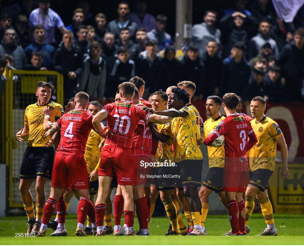 30 September 2024; Shelbourne and St Patrick's Athletic players tussle during the SSE Airtricity Men's Premier Division match between Shelbourne and St Patrick's Athletic at Tolka Park in Dublin. Photo by Stephen McCarthy/Sportsfile
