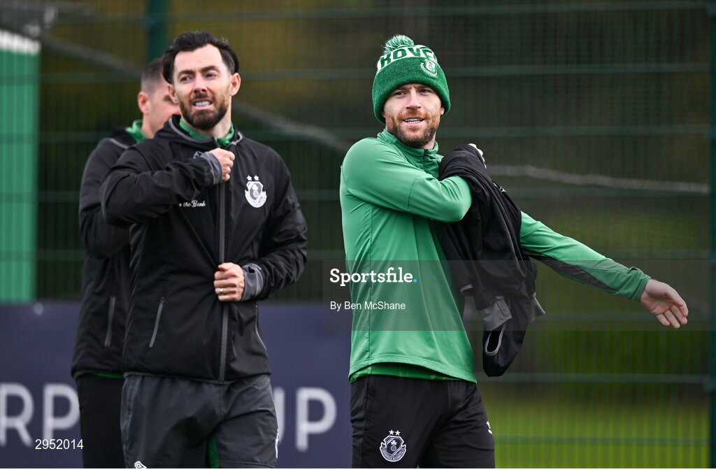 2 October 2024; Jack Byrne, right, and Richie Towell during a Shamrock Rovers squad training session at the Roadstone Group Sports Club in Dublin. Photo by Ben McShane/Sportsfile