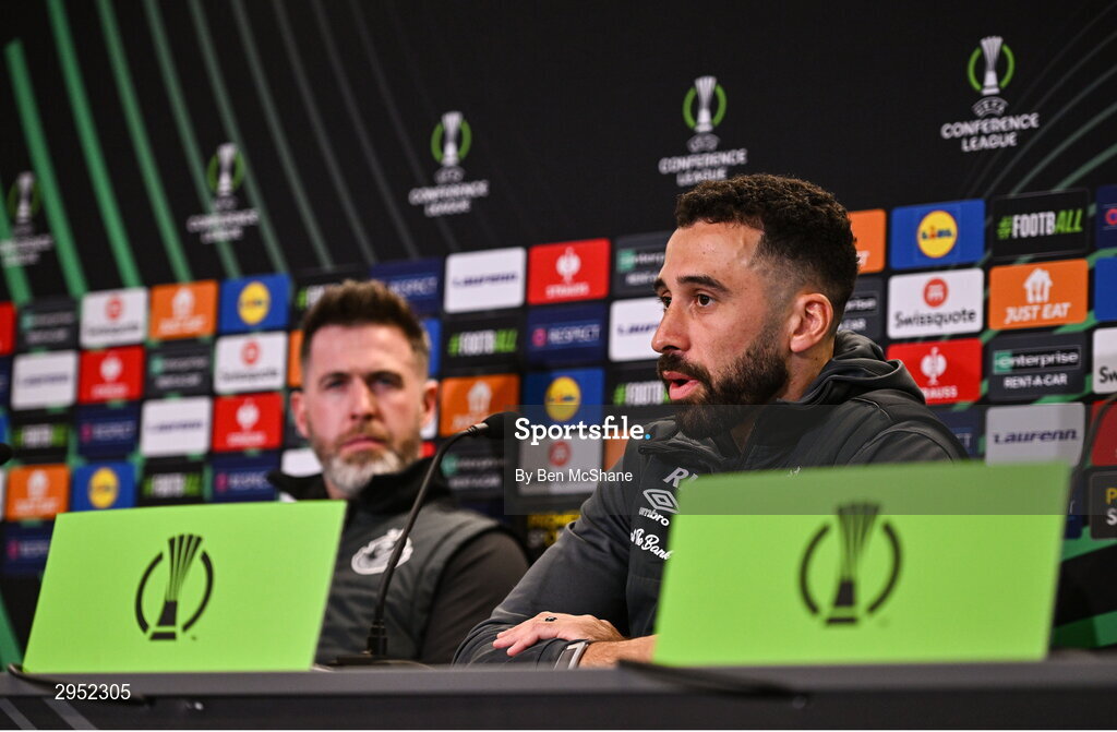 2 October 2024; Roberto Lopes, right, and manager Stephen Bradley speak to the media during a Shamrock Rovers press conference at Tallaght Stadium in Dublin Photo by Ben McShane/Sportsfile