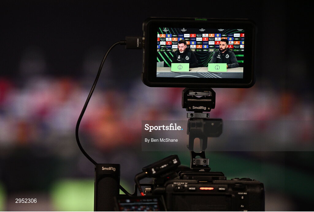 2 October 2024; Manager Stephen Bradley, left, and Roberto Lopes speak to the media during a Shamrock Rovers press conference at Tallaght Stadium in Dublin Photo by Ben McShane/Sportsfile