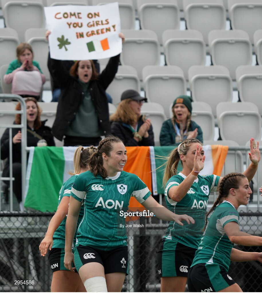 5 October 2024; Eve Higgins of Ireland celebrates a try by teammate Eimear Considine during the Women's WXV1 Rugby International Pool match between Canada and Ireland at Langley Events Centre in Vancouver, Canada. Photo by Joe Walsh/Sportsfile