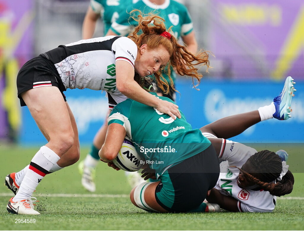 5 October 2024; Fiona Tuite of Ireland is tackled by Alex Tessier and Alexandria Ellis of Canada during the Women's WXV1 Rugby International Pool match between Canada and Ireland at Langley Events Centre in Vancouver, Canada. Photo by Rich Lam / World Rugby via Sportsfile