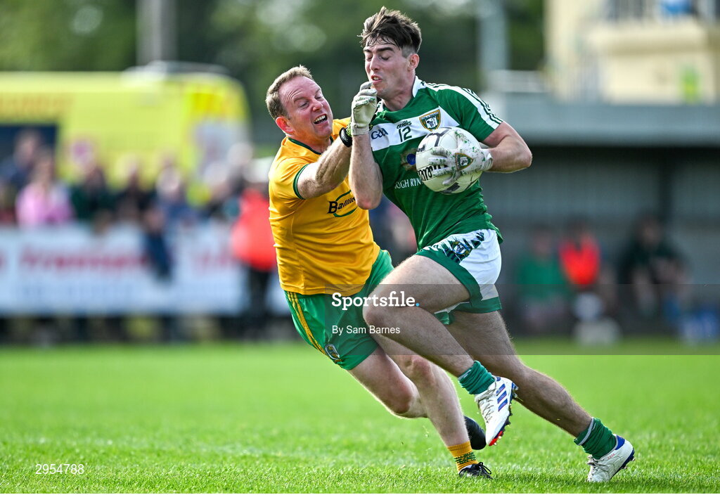 6 October 2024; Evan Harkin of Mohill in action against Liam Ferguson of Ballinamore Sean O'Heslins during the Leitrim County Senior Club Football Championship final match between Ballinamore Sean O'Heslins and Mohill at Ballinamore Sean O'Heslins GAA Club in Leitrim. Photo by Sam Barnes/Sportsfile